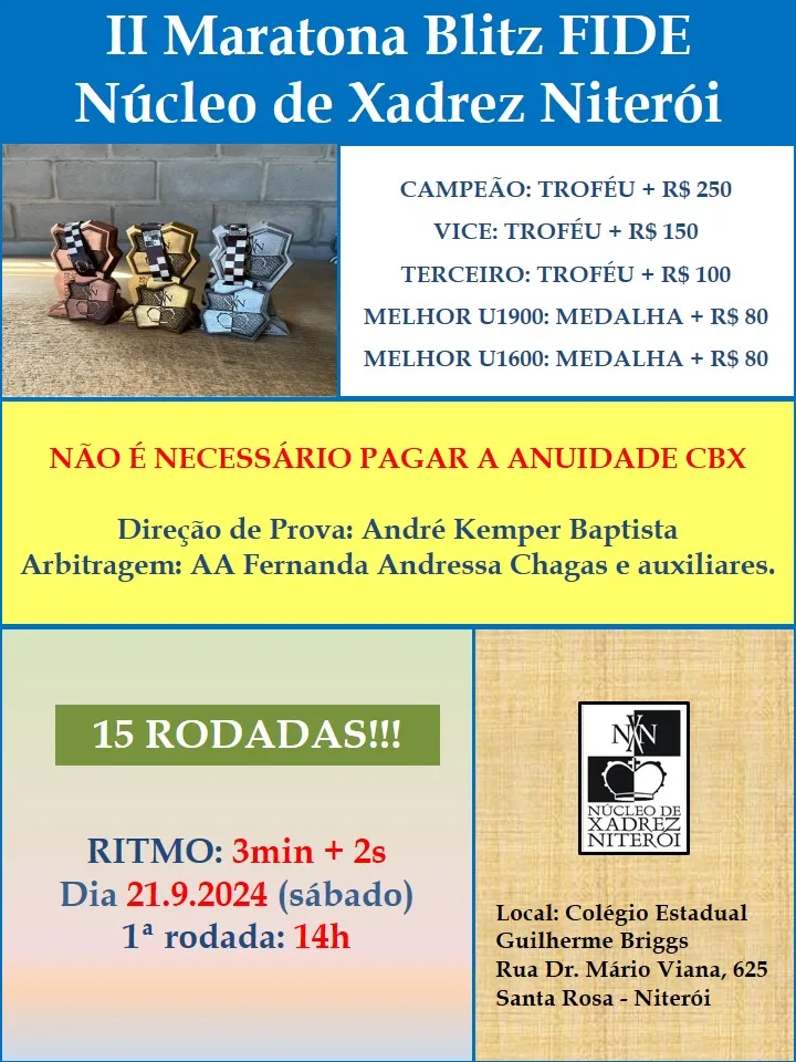 Sábado, 28 de setembro, ocorrerá o torneio FIDE de partidas rápidas.