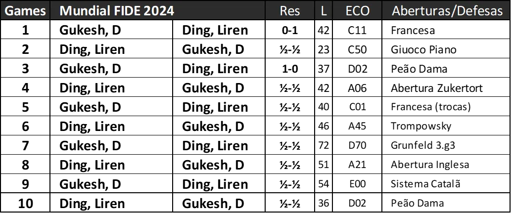 Ding Liren escolheu o Sistema de Londres contra Gukesh no Jogo 10 do Mundo Campeonato de Xadrez. Ding estava tentando uma vantagem muito pequena e depois 10…Ch5 que custou a Gukesh um pouco de tempo no relógio que se tornou aparentemente Ding não tinha nenhuma ideia para causar problemas. No lance 16 foi impossível imaginar outra coisa senão um empate e que aconteceu no lance 36.