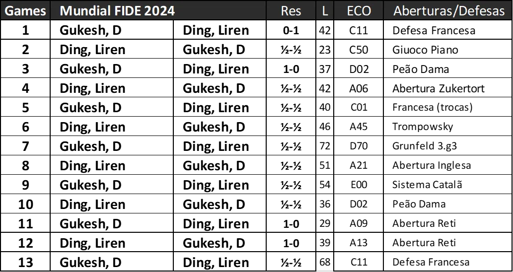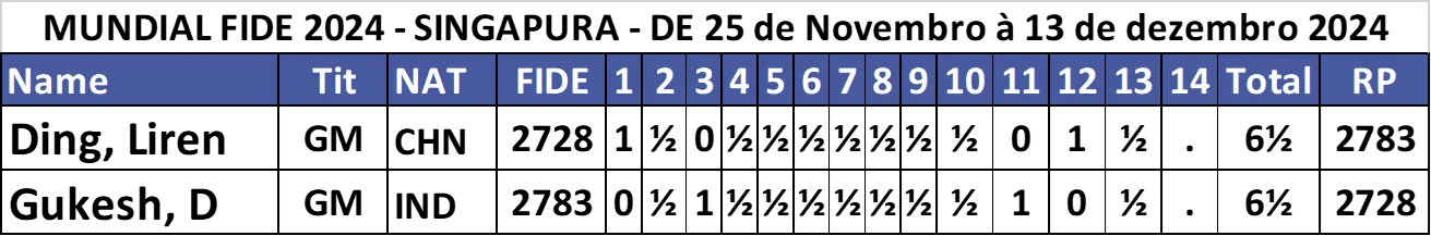 12 de dezembro Jogo 14 Ding-Gukesh. É pelo menos concebível que Ding acha que suas melhores chances estão nos tie-breaks e ele vai jogar muito seguro. Mas talvez ele sinta que Gukesh é vulnerável e que amanhã é sua melhor chance. Os desempates serão no dia 13 de dezembro, se necessário.