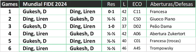 Pelo segundo Campeonato Mundial consecutivo, Ding Liren optou pelo Sistema de Londres no jogo 6. Essa escolha, que lhe rendeu uma vitória crucial contra Ian Nepomniachtchi no ano passado em Astana, retornou em Cingapura. Notavelmente, o jogo de Ding em 2023 foi a primeira vez que o Sistema de Londres foi usado em uma partida do Campeonato Mundial.