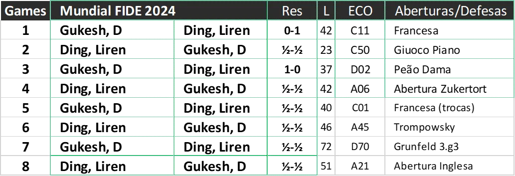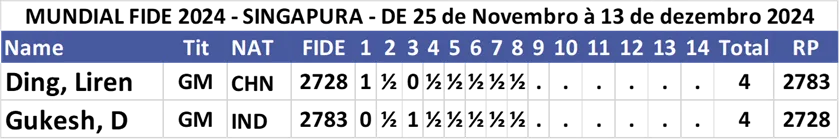 Na partida de quarta-feira, Ding tentou 1.c4, a abertura inglesa, marcando seu quarto lance de abertura diferente com as brancas. Essa diversidade tem sido uma característica definidora da partida, em contraste com os confrontos em que os jogadores se limitam a sondar sistemas específicos. Apesar da variedade de Ding, foi Gukesh quem introduziu uma novidade, elaborada por sua equipe bem preparada. O prodígio indiano mais tarde reconheceu sua equipe de apoio, particularmente Grzegorz Gajewski, dizendo: