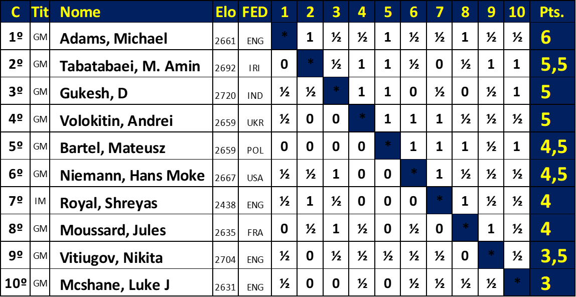 O lendário GM inglês Michael Adams, de 52 anos, venceu o 13º London Chess Classic após um desempenho incrível, terminando o evento invicto e marcando 6,5/9.