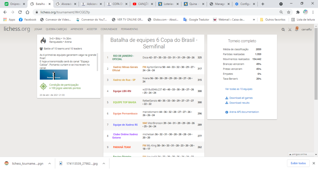 Torneios LICHESS COPA DO BRASIL 2ª FASE (SEMIFINAL) AF Carlos Carvalho 21 de abril de 2021 20 DE ABRIL DE 2021 – https://lichess.org/tournament/WrCGEZfp – EQUIPE RIO DE JANEIRO CAMPEÃ 1959 PARTIDAS DA SEMIFINAL. Capivara subserviente do Xadrez AF Carlos Carvalho Capivara Subserviente do Xadrez See author's posts Post navigation Previous: COPA CHESSFLIX 2021Next: VI COPA DO BRASIL XADREZ ONLINE 3+0 Deixe um comentário Cancelar respostaO seu endereço de e-mail não será publicado. Campos obrigatórios são marcados com *Comentário * Nome * E-mail * Site Salvar meus dados neste navegador para a próxima vez que eu comentar.