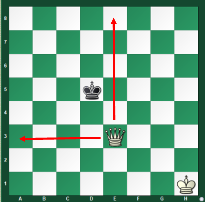 Branco usa suas duas rainhas para empurrar o rei negro para uma das bordas do tabuleiro (uma vez lá, ele não pode dar um passo para trás fora de perigo), onde levará xeque mate. l.Dh5+ Re6