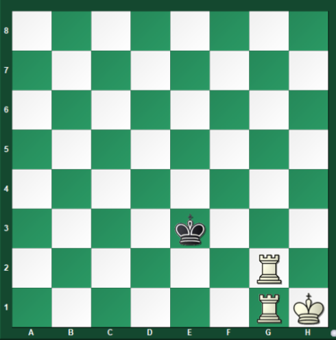l… Rd3 Agora, o Rei preto não pode usar as casas da coluna E, já que as mesmas estão controlado por uma torre branca. Também era possível l… Rf3 quando 2.Tf2+?? Rxf2 seria um pesadelo. No entanto, o mate ocorrerá rapidamente se o branco se lembrar de manter suas Torres longe do Rei do Negro: l… Rf3 2.Tg8! Rf2 (Ameaçando a outra torre.) 3.Te7 (E não 3.Ree8 desde então nosso “trabalho de escada” não seria possível.) 3…Rf3 4.Tgf8+ Rg4 5.Tg7+ Rh5 6.Th8 mate.