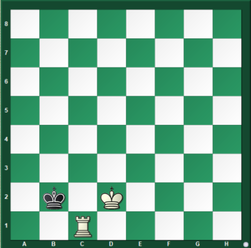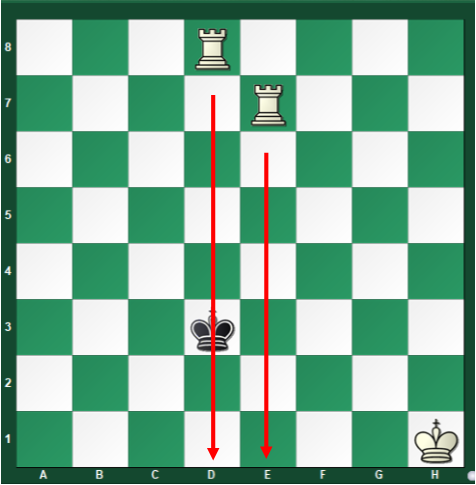 2.Tg8 Ganhando distância do Rei negro para que possa dar o xeque sem ser atacada. 2 … Rd2 Ameaçar essa torre é um ato de desafio, mas obranco não deixa que ela seja capurada. 3.Te7 Esta Torre cria distância do rei oponente enquanto mantém seu controle das casas da coluna “E”. Agora, o branco está finalmente pronto para empurrar o Rei negro para a ala da dama, onde receberá xeque mate. 3 … Rd3 4.Td8+