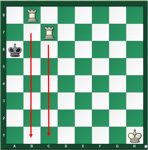 As duas Torres controlam os arquivos e e d, forçando assim o Rei negro à esquerda. 4…Rc4. O Rei foi forçado a ir para a esquerda, uma vez que a coluna”D” está dominada pela Torre, que está em e7. 5.Tc7+ Agora, as Torres controlam as colunas “C” e “D”, e o Rei do Preto cada vez mais próximo da temida borda do tabuleiro. 5 .. .Rb5 6.Tb8+ O Rei Preto finalmente à borda do tabuleiro. 6…Ra6 Cuidado!!! 7.Ta7+ devido a 7 … Rxa7. 7.Rcl