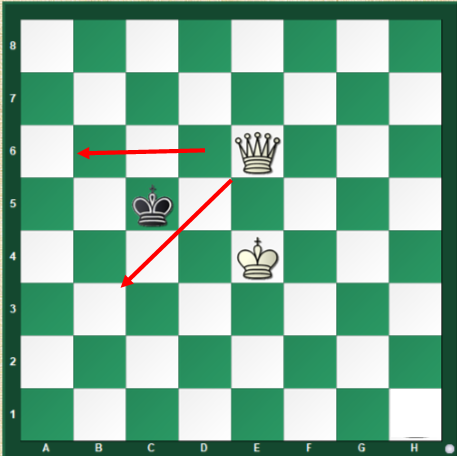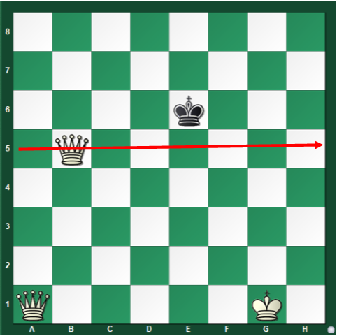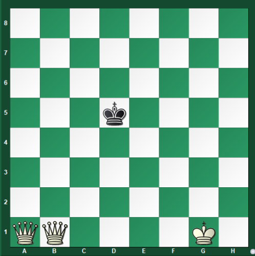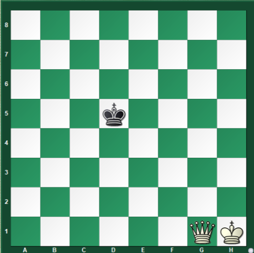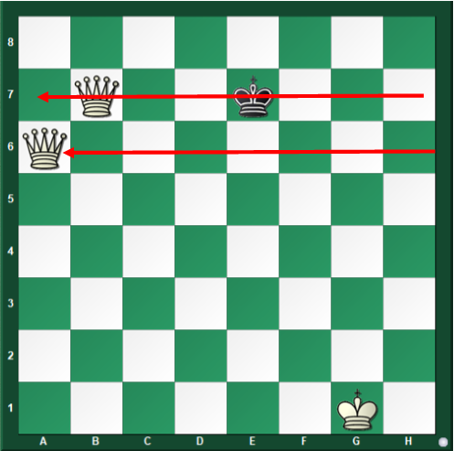 Branco usa suas duas rainhas para empurrar o rei negro para uma das bordas do tabuleiro (uma vez lá, ele não pode dar um passo para trás fora de perigo), onde levará xeque mate. l.Dh5+ Re6