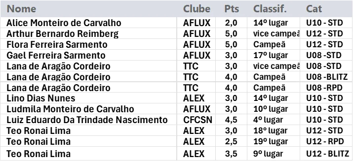 Na categoria Sub-8 Feminino (STD), a jovem enxadrista Lana Cordeiro garantiu o 2º lugar, mostrando um desempenho sólido ao longo do torneio, alem ser a campeã nesta categoria nas modalidades BLITZ e RPD. Na categoria Sub-12 Feminino (STD), Flora Sarmento brilhou ao conquistar a 1ª colocação, consolidando-se como um dos grandes talentos da nova geração do xadrez fluminense.
