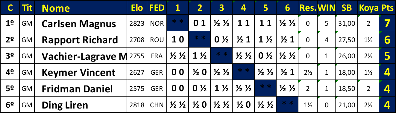 Os jogadores competem em um round robin duplo, com duas rodadas acontecendo por dia. Os jogos estão no controle de tempo “clássico rápido”, com os jogadores tendo 45 minutos para o jogo inteiro e um incremento de 10 segundos. No último dia do evento, os jogadores competem em playoffs para determinar suas colocações finais, com o primeiro jogando contra o segundo, o terceiro contra o quarto e o quinto contra o sexto.