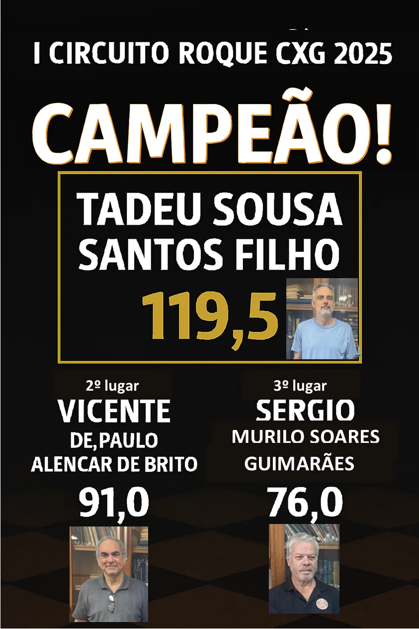 Com o encerramento do I Circuito Roque CXG 2025, celebramos uma competição marcada por alto nível técnico, regularidade ao longo das etapas e forte espírito esportivo entre todos os participantes. Ao longo das sete rodadas, o circuito consolidou-se como um marco importante no calendário, valorizando o desempenho consistente e a dedicação dos enxadristas envolvidos.