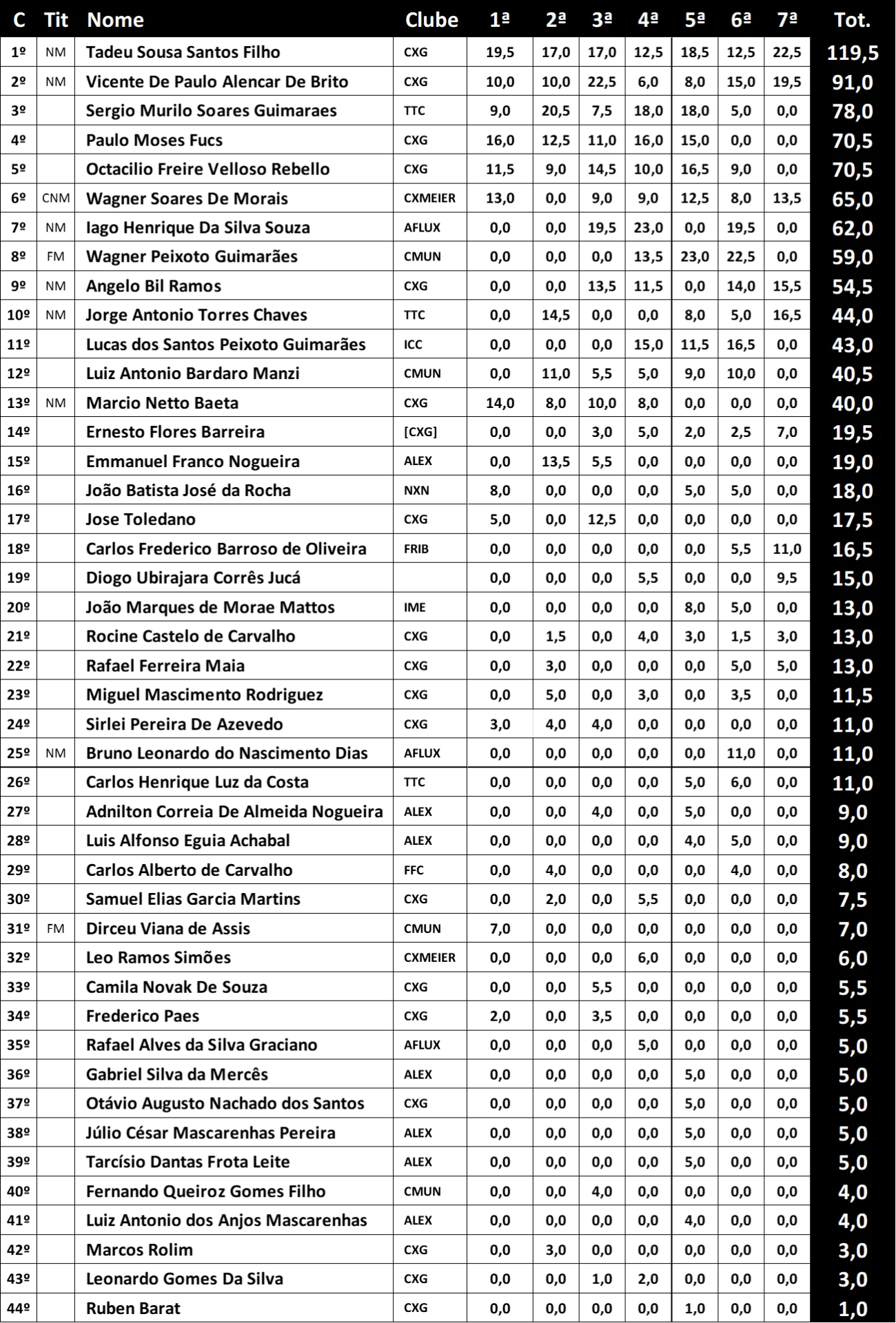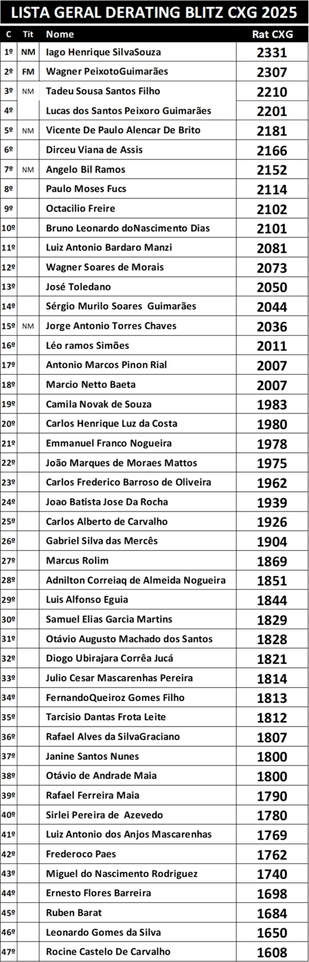 ️ A todos os participantes — mestres, enxadristas experientes e promessas em ascensão — nosso reconhecimento pela dedicação e pelo espetáculo proporcionado. Cada nome na tabela representa uma história de esforço, aprendizado e amor pelo xadrez.