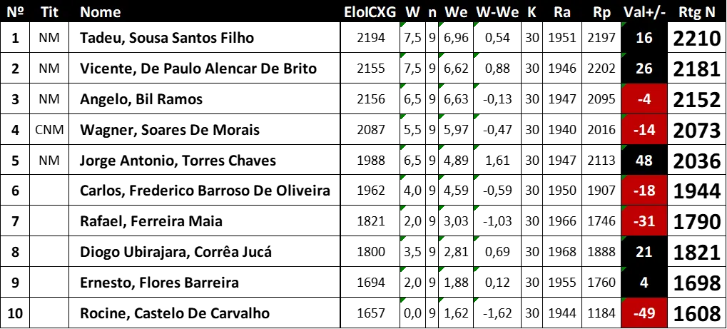 Destaque também para NM Tadeu Sousa Santos Filho e Octacilio Freire, ambos do CXG, que dividiram a vice-liderança com 6,5 pontos, demonstrando técnica refinada e garra em cada partida.