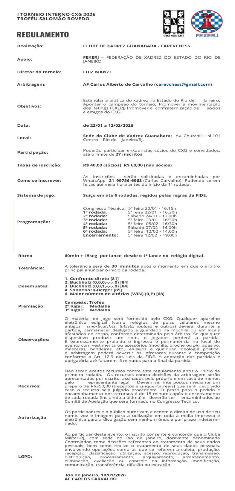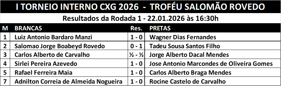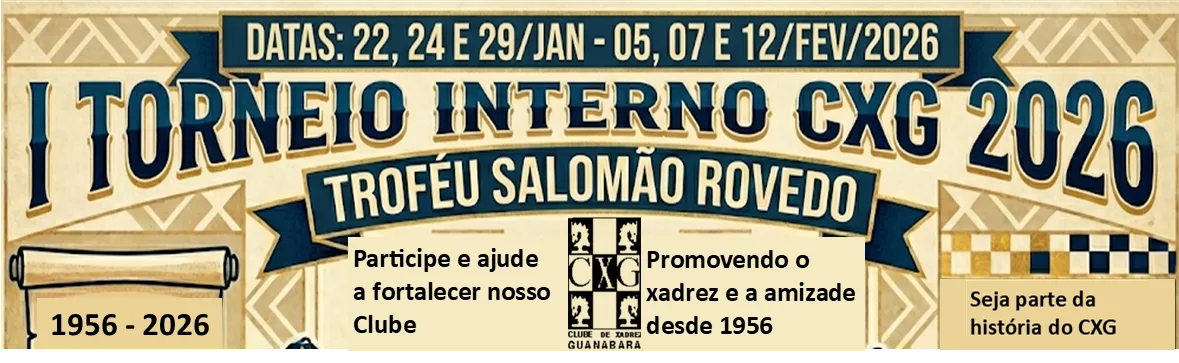 É com grande entusiasmo e profundo respeito pelo esporte-mente que abrimos oficialmente o I Torneio Interno CXG 2026 – Troféu Salomão Rovedo, evento que marca o início de mais um capítulo na história do Clube de Xadrez Guanabara.