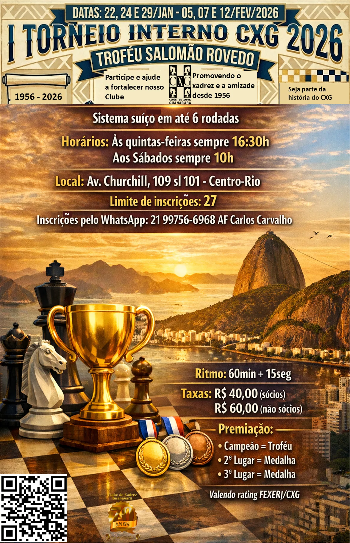 Nos reunimos aqui, a partir de 22 de janeiro de 2026, na sede do Clube de Xadrez Guanabara (Av. Churchill, 109 – Sala 101, Centro – Rio de Janeiro), para celebrar não apenas a competição, mas também a convivência, a análise estratégica e o espírito de camaradagem que o xadrez promove. O torneio seguirá o sistema suíço em até seis rodadas, disputadas sempre às quintas-feiras (16:30h) e sábados (10:00h), até a conclusão previstapara 12 de fevereiro de 2026.