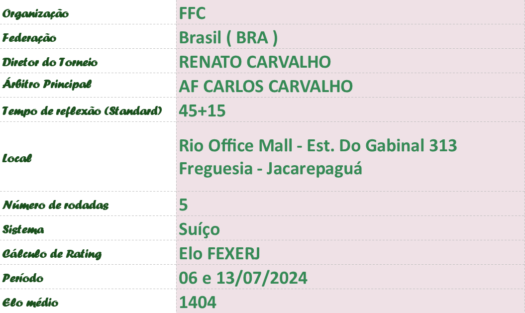 A competição será disputada pelo Sistema Suíço em 5 rodadas. Será usado o Programa Swiss Manager e o ritmo de jogo será de 45 min + 15 seg. de acréscimo para cada jogador com relógio digital ou 60min KO em relógio mecânico.