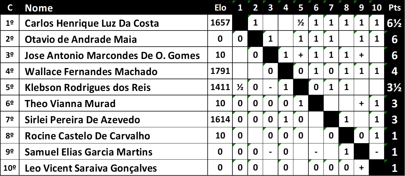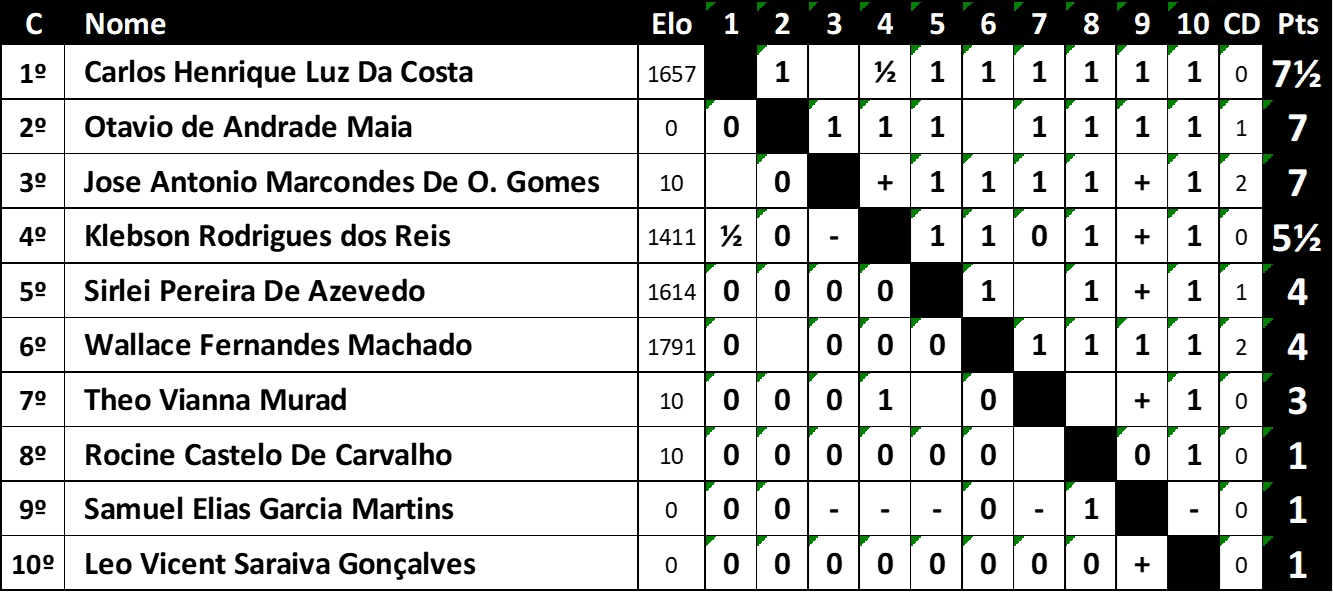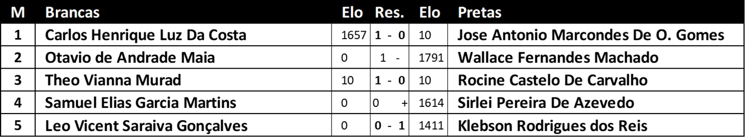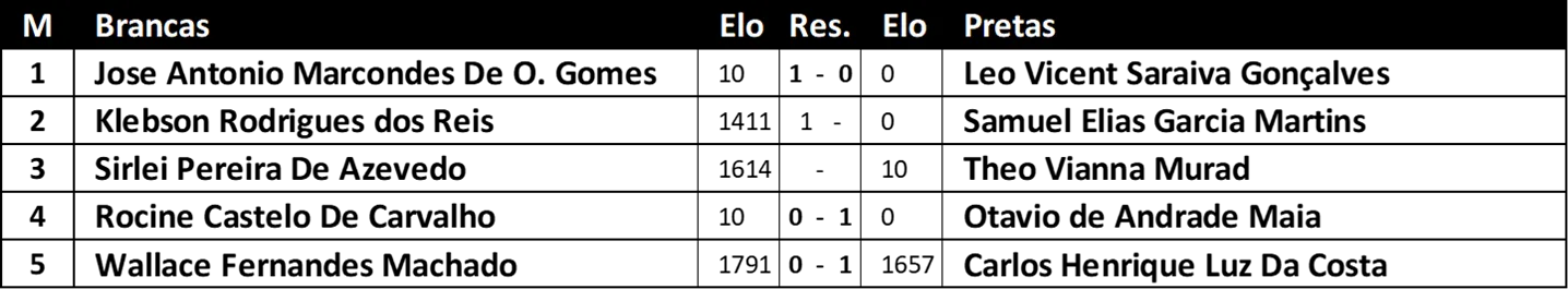 1. Amigo Carev. Vi a tabela do torneio e acho que já na 3a rodada dá pra liquidar tudo. Então: Fide Id 2111381 Rtg. 1727; CBX Id 789 Rtg. 1714; Cat S75 (Fide). Abraço.