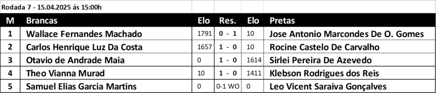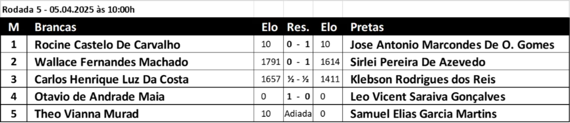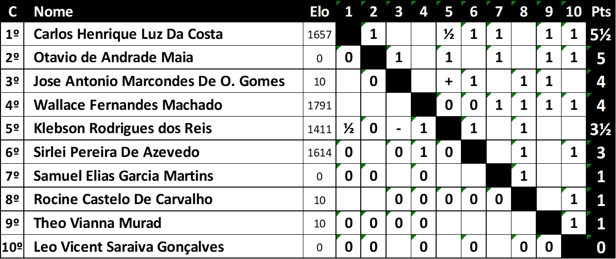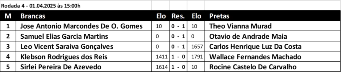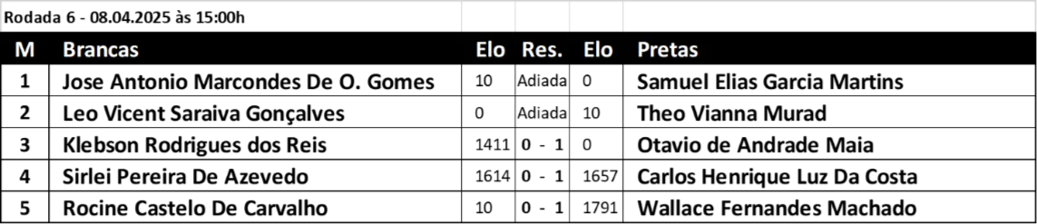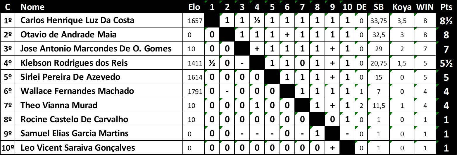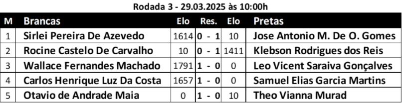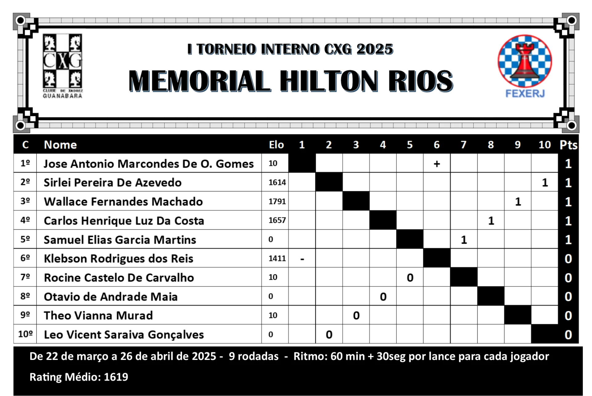1. Amigo Carev. Vi a tabela do torneio e acho que já na 3a rodada dá pra liquidar tudo. Então: Fide Id 2111381 Rtg. 1727; CBX Id 789 Rtg. 1714; Cat S75 (Fide). Abraço.
