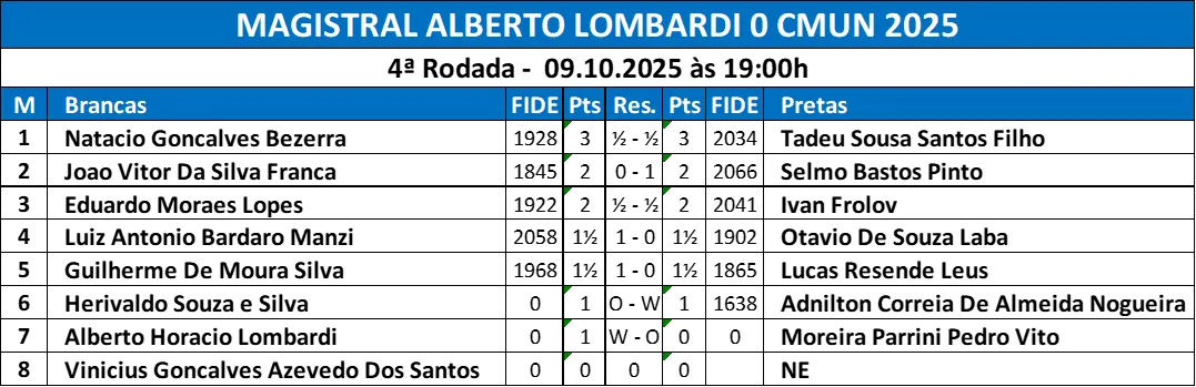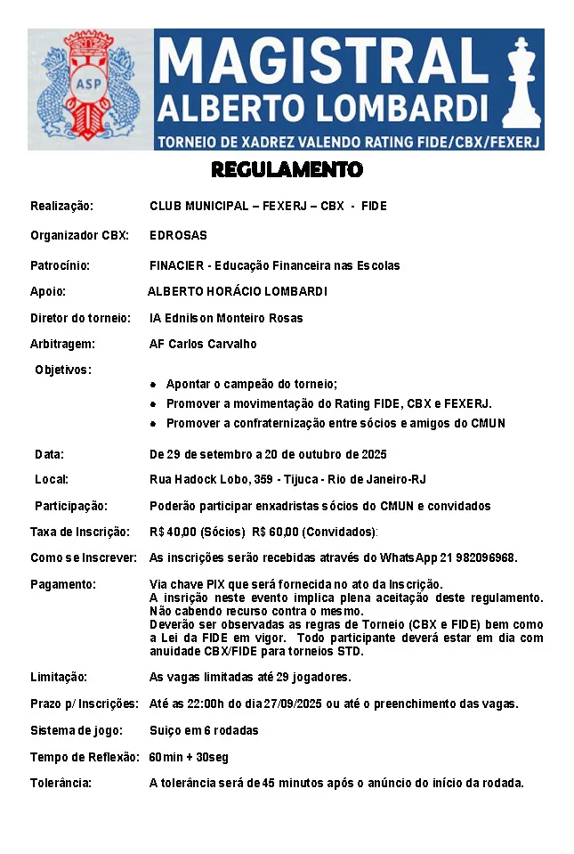 É com imensa honra e entusiasmo que damos início ao MAGISTRAL ALBERTO LOMBARDI – CMUN 2025, torneio oficial de xadrez valendo rating FIDE, CBX e FEXERJ, reunindo mentes brilhantes e corações apaixonados pelo jogo milenar da estratégia e da inteligência.