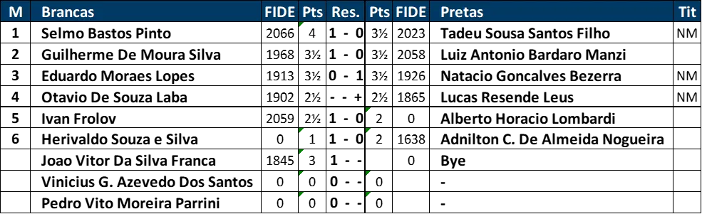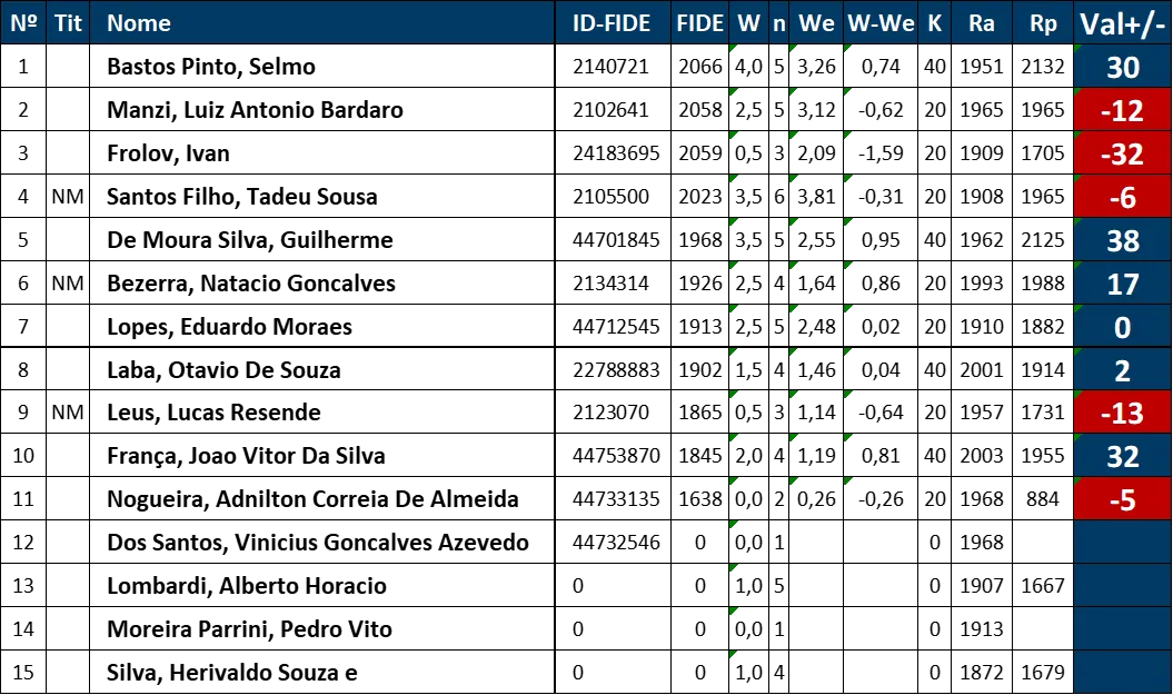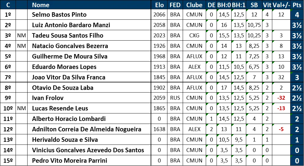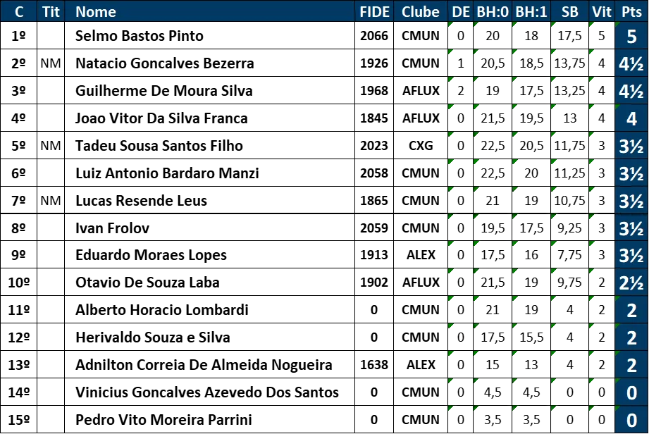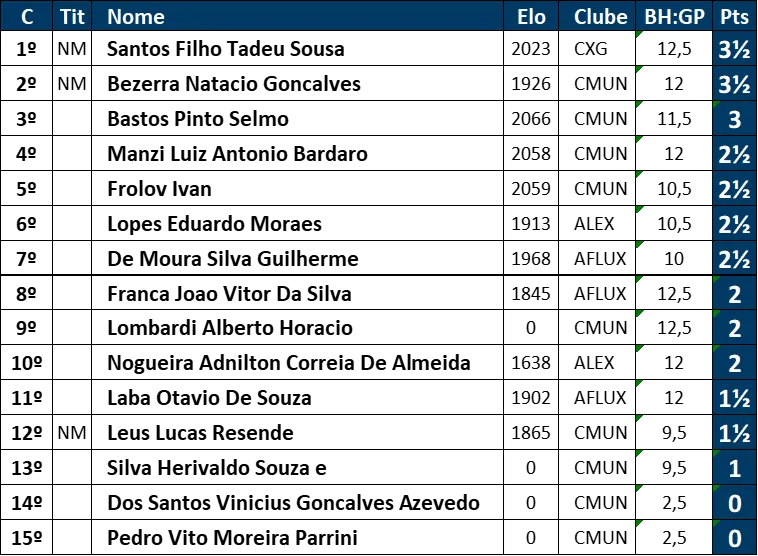 Excelência em cada lance Ao longo das rodadas, os participantes mostraram não apenas técnica refinada, mas também resiliência e espírito esportivo. A tabela final reflete o alto nível da competição, com jogadores separados por margens mínimas nos critérios de desempate como BH:1 e Sonneborn-Berger (SB), evidenciando o equilíbrio e a qualidade dos confrontos.