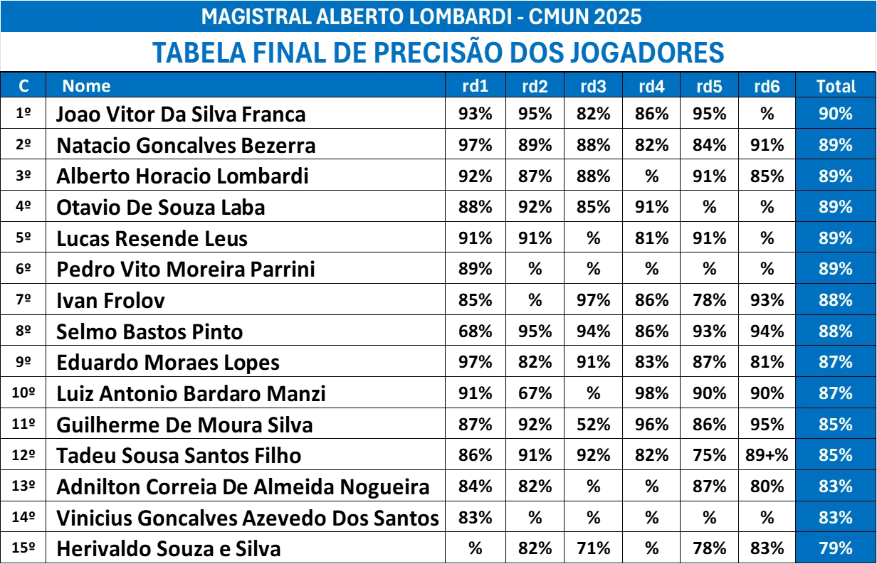 Destaques da competição Com uma performance sólida e consistente, o campeão conquistou o topo da tabela com mérito, acumulando o maior número de pontos e vitórias. Mas cada nome listado representa uma trajetória digna de reconhecimento — seja pela superação, pela ousadia nas partidas ou pela contribuição ao espetáculo que foi este torneio.