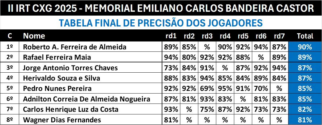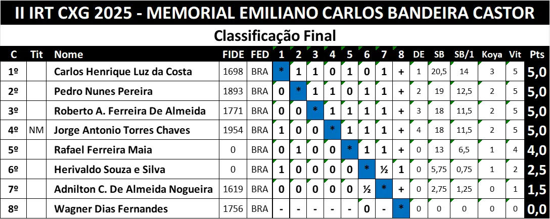 Todas as profissões possuem seu valor, mas todas elas nascem de uma chamada professor! O Torneio FIDE IRT Professor Emiliano Carlos Bandeira Castor recebeu este nome para homenagear postumamente ao Professor de Educação de Física, Instrutor de Xadrez e Enxadrista que no final dos anos setenta acrescentou as suas aulas o ensino do Xadrez na escola pública que lecionava, além de participar de torneios de xadrez da federação do Rio de Janeiro, ser árbitro da FEXERJ, e ter colaborado como professor de xadrez no Clube Municipal, Programa de Xadrez da Fundação Roberto Marinho e ativo jogador de Xadrez por correspondência. Neste século XXI, anos de evolução acelerada (Internet , Inteligência.