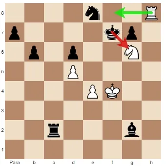 Poderíamos descartar a variante da sequência 1. Rh8+ Rf7 2. Be8+ Cxe8. Porque se dermos check com a torre, o rei comerá nosso cavalo e, se não, ficaremos com uma peça faltando de qualquer maneira.