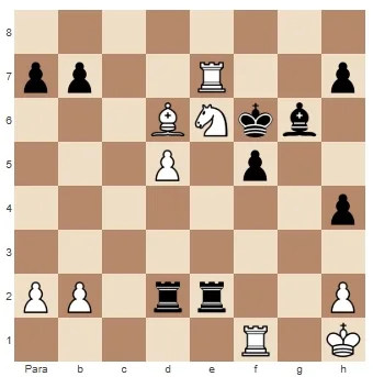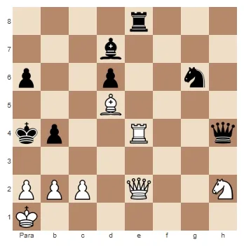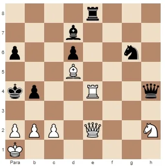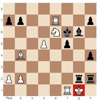 Aqui, as brancas moveram incrivelmente o bispo defendendo o peão de h2 para b4, permitindo o padrão de mate de 2 torres na sétima com o rei bloqueado. Depois de 1… Txh2+ 2. Tg1 Tg2#.