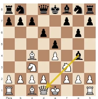 Nesta posição, parece que não temos nada melhor do que aceitar a mudança de Damas, já que movemos a rainha para onde a movemos no próximo lance eles nos farão um ataque duplo com xeque. No entanto, antes de nos resignarmos, devemos dar uma olhada no tabuleiro em busca de algum sinal tático. Nesse caso, a situação do bispo negro, que está trancado e sem escapatória, é poderosamente impressionante.