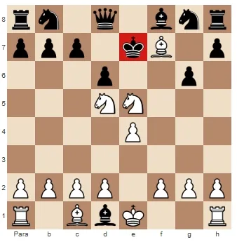 Mas se nos aprofundarmos na análise, veremos que há um excelente movimento silencioso, sobre o qual falarei mais tarde, que dá suporte ao cavalo e faz com que a variação termine em mate: 3. Rg5 Bxe4 4. Rf8#