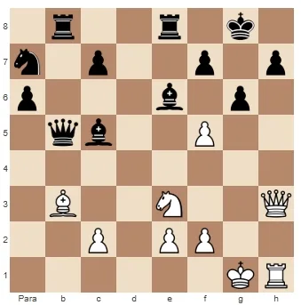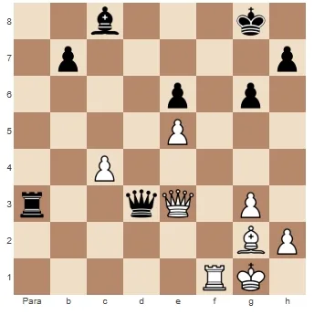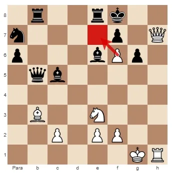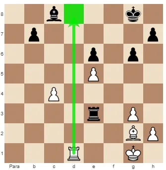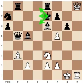 Então jogamos 1.Dc5! ameaçando capturar o bispo e mate na casa f8. 1… De3+ As pretas não têm escolha a não ser forçar a troca de Damas. 2. Dxe3 Txe3 3. Td1! As pretas libertaram o arquivo e o bispo inevitavelmente cairá.