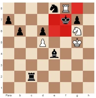 Poderíamos descartar a variante da sequência 1. Rh8+ Rf7 2. Be8+ Cxe8. Porque se dermos check com a torre, o rei comerá nosso cavalo e, se não, ficaremos com uma peça faltando de qualquer maneira.