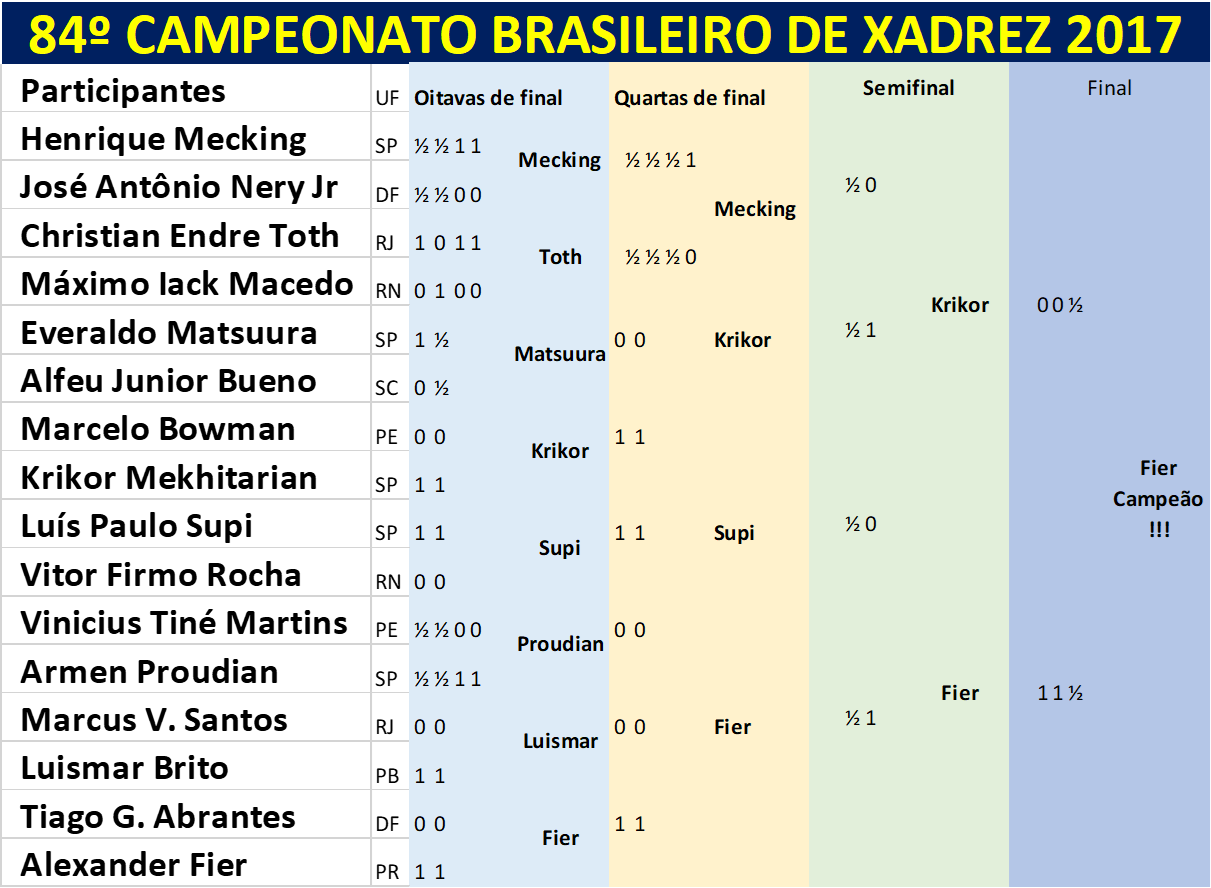 Sobre a atuação de Fier, ele chegou à Final depois de haver eliminado (com uma boa dose de sorte!) o GM Luís Paulo Supi. Seu adversário na final foi o GM André Diamant, que havia eliminado o GM Darcy Lima. No confronto entre Fier e Diamant, ocorreram dois empates nas duas primeiras partidas, seguidas por duas vitórias de Fier, ambas bastante convincentes, inclusive a quarta e última contou com um belo sacrifício de dama para o arremate final. Parabenizamos o GM Alexandr Fier pela importante conquista de mais um título nacional, o terceiro da sua carreira. Depois da vitória, o novo Campeão Brasileiro de xadrez postou uma foto no seu perfil do Facebook, para comemorar a façanha! Essa é justamente a foto que iremos mostrar para ilustrar a nossa matéria, já que a CBX ainda não postou no seu site as fotos da premiação das finais do Campeonato Brasileiro, nem do Absoluto e nem do Feminino, numa clara demonstração do quanto a entidade ainda precisa melhorar no tocante à cobertura dos eventos oficiais que ela própria realiza!