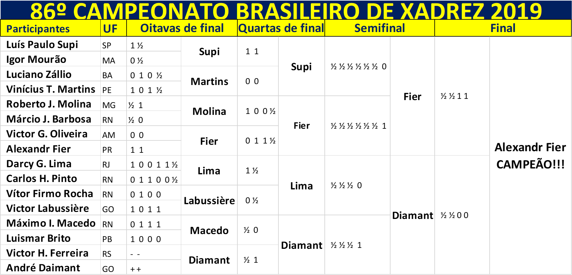 Sobre a atuação de Fier, ele chegou à Final depois de haver eliminado (com uma boa dose de sorte!) o GM Luís Paulo Supi. Seu adversário na final foi o GM André Diamant, que havia eliminado o GM Darcy Lima. No confronto entre Fier e Diamant, ocorreram dois empates nas duas primeiras partidas, seguidas por duas vitórias de Fier, ambas bastante convincentes, inclusive a quarta e última contou com um belo sacrifício de dama para o arremate final. Parabenizamos o GM Alexandr Fier pela importante conquista de mais um título nacional, o terceiro da sua carreira. Depois da vitória, o novo Campeão Brasileiro de xadrez postou uma foto no seu perfil do Facebook, para comemorar a façanha! Essa é justamente a foto que iremos mostrar para ilustrar a nossa matéria, já que a CBX ainda não postou no seu site as fotos da premiação das finais do Campeonato Brasileiro, nem do Absoluto e nem do Feminino, numa clara demonstração do quanto a entidade ainda precisa melhorar no tocante à cobertura dos eventos oficiais que ela própria realiza!