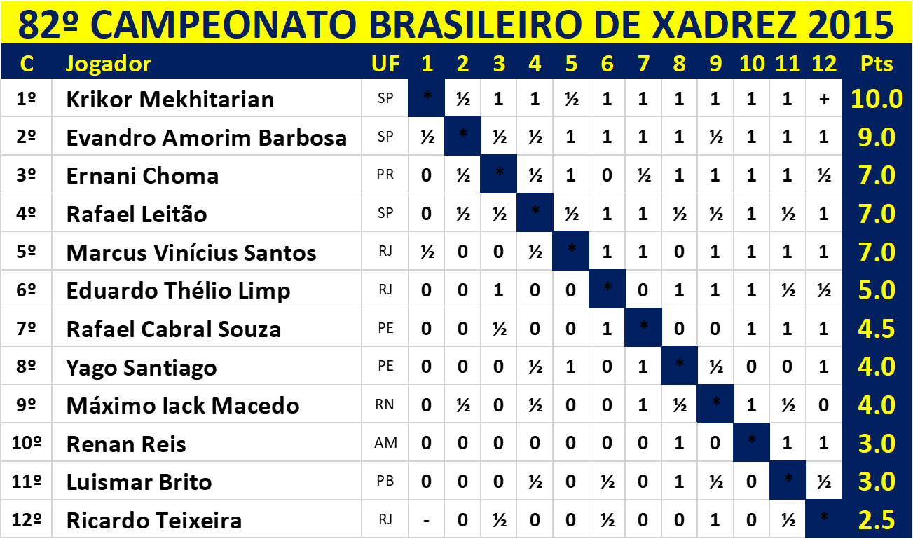 O tempo de reflexão foi o de 90min + 30seg. Desempates: Rápido – 25min + 10seg – Blitz – 3+2 – Aramgedon 6′-5′