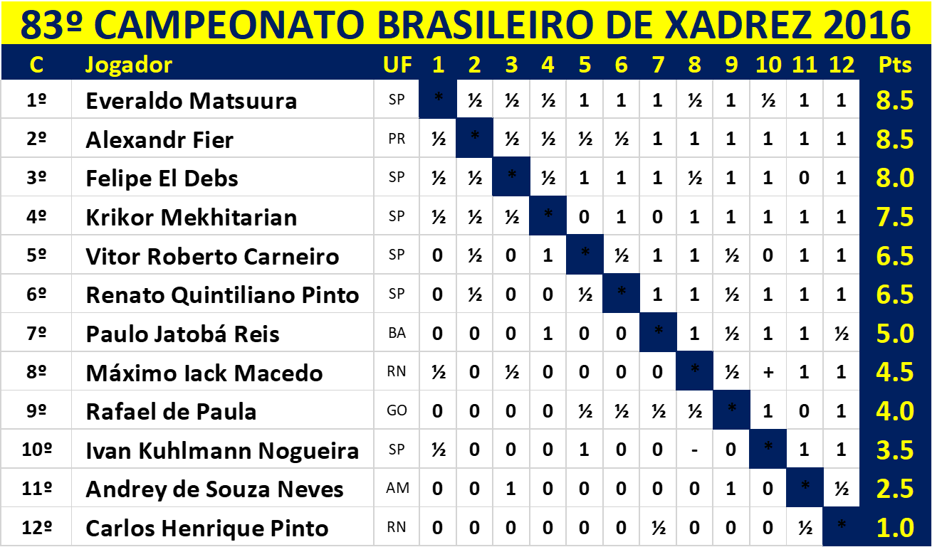 O campeão foi Everaldo Matsuura, com grande atuação desde a primeira rodada. Matsuura terminou a competição invicto, com seis vitórias e cinco empatres. Matsuura e Fier terminaram o campeonato empatado em pontos, mas o título foi para Matsuura nos critérios de desempates. Foi a segunda vez que conquistou o Brasileiro. A primeira foi em 1991, em Bebedouro (SP), com 20 anos de idade e sem título internacional (o título de Mestre Internacional, ele conseguiu em 1996; o de Grande Mestre, em 2010). Agora, no Clube de Xadrez Guanabara, conquistou o Brasileiro, com 46 anos de idade. O Brasileiro de 2016 contou com quatro enxadristas com o título de Grande Mestre: Matsuura, Fier, El Debs e Krikor.