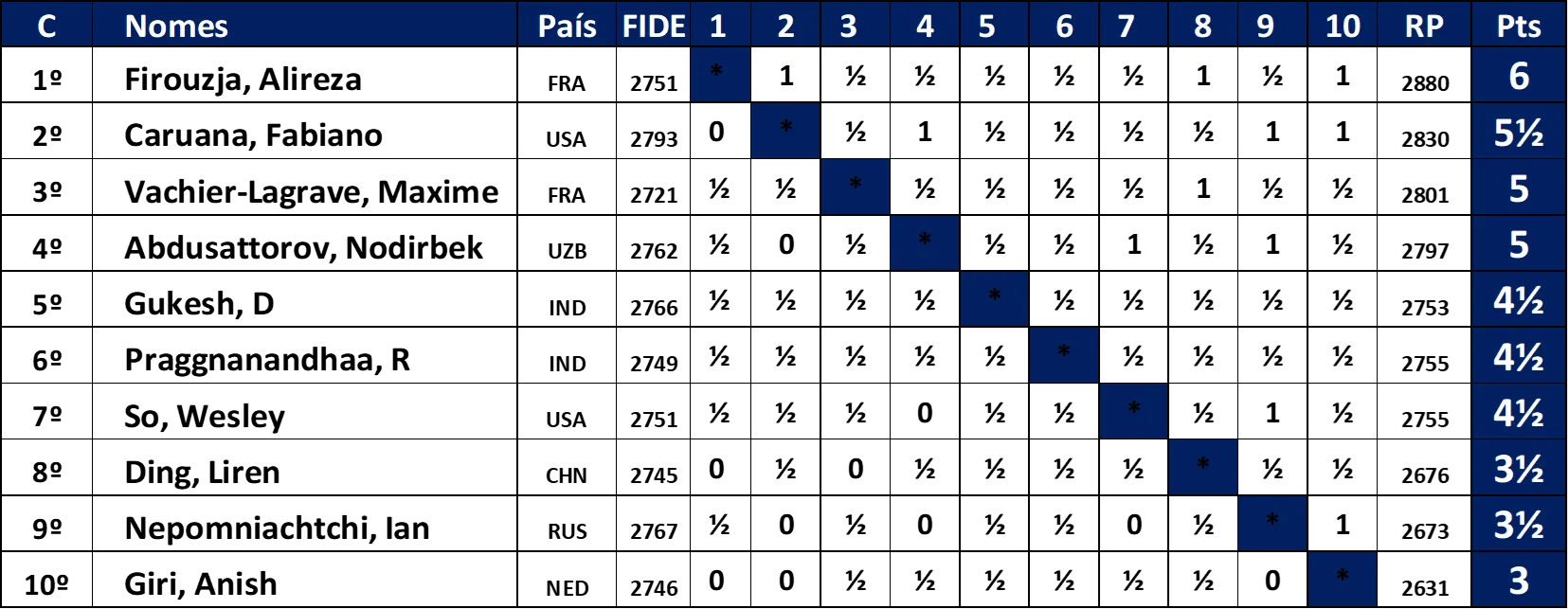 A Defesa Francesa: Variação MacCutcheon foi a abertura jogada em Firouzja-Praggnanandhaa e a partida se tornou uma volta da vitória para o número cinco do mundo depois que ele fez uma troca de dama no lance 20. O representante francês precisou resistir a um brilho, 25…Tb8!!, antes que seu oponente estivesse disposto a aceitar um empate.