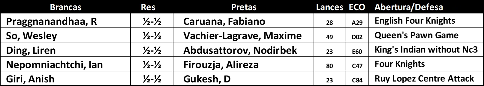 O campeão mundial e seu adversário mais recente, os GMs Ding Liren e Ian Nepomniachtchi, foram derrubados pelos GMs Nodirbek Abdusattorov e Maxime Vachier-Lagrave, respectivamente.