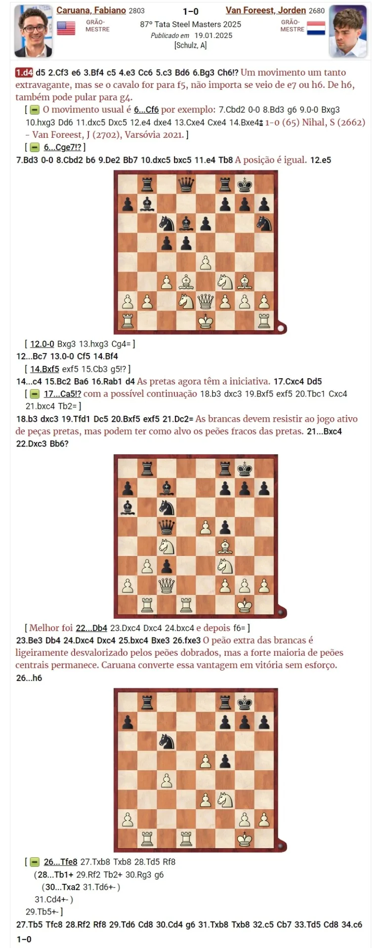 A terceira vitória do dia veio de Fabiano Caruana contra Jorden van Foreest. O jogador holandês respondeu ao Sistema de Londres de Caruana com um conceito interessante (um cavalo em h6) e teve a iniciativa após a abertura. No entanto, no momento crítico, Van Foreest não conseguiu encontrar a melhor solução, e o jogo tomou um rumo diferente.