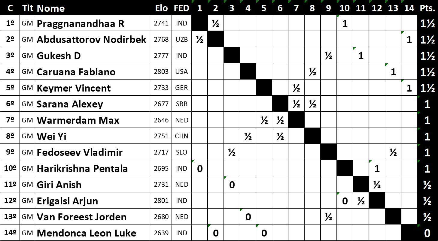 Classificação da 2ª rodada do Masters: 1º = Praggnanandhaa, Abdusattorov, Gukesh, Caruana, Keymer 1,5pts, 6º = Sarana, Warmerdam, Wei Yi, Fedoseev, Harikrishna 1pt, 11º = Giri, Erigaisi, Van Foreest 0,5pts, 14º Mendonça 0pts,