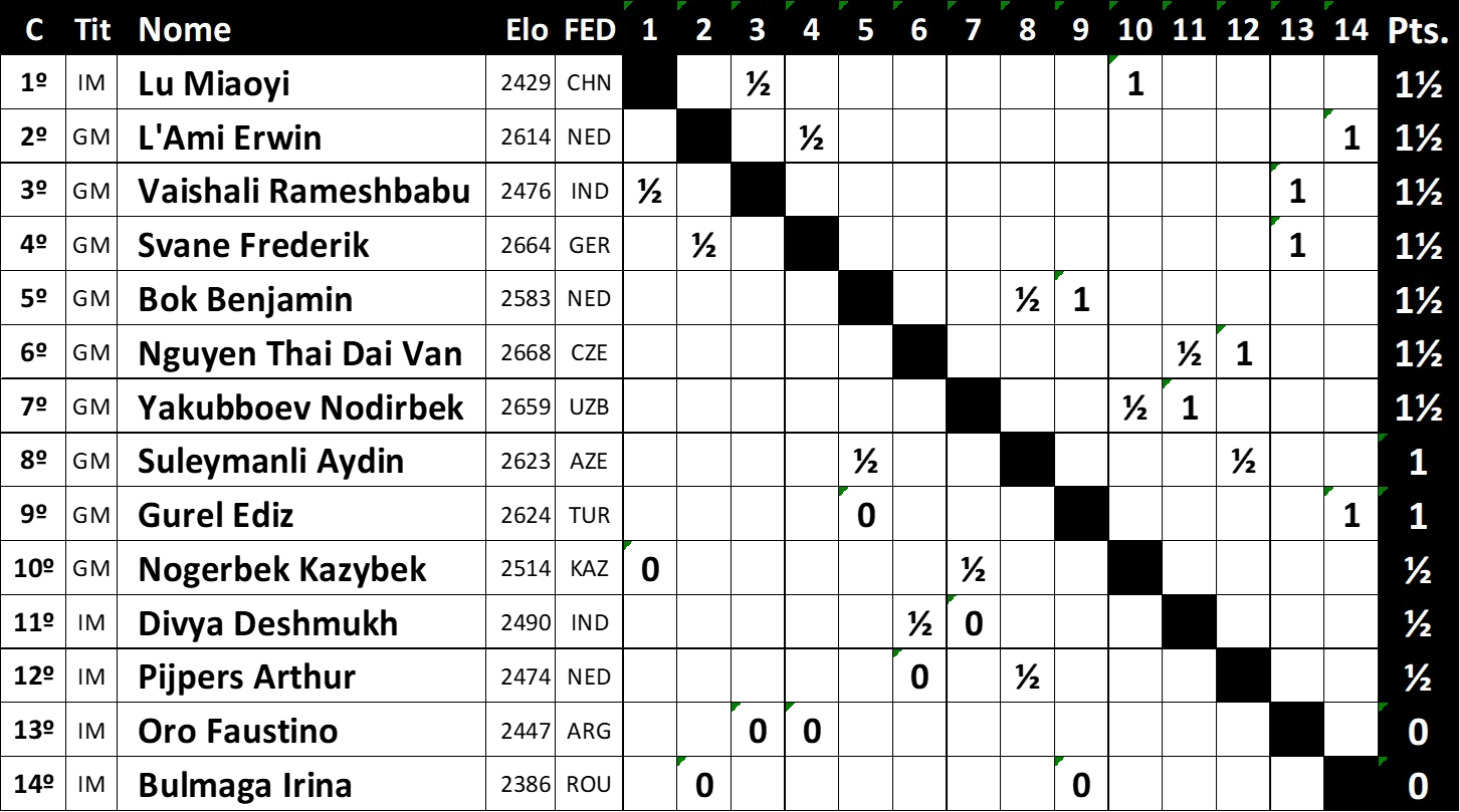 Classificação da 2ª rodada do Challengers: 1º = Lu Miaoyi, L’Ami, Vaishali, Frederik Svane, Bok, Nguyen, Yakubboev 1.5pts, 8º = Suleymanli, Gurel 1pt, 10º = Nogerbek, Divya, Pijpers 0,5pts, 13º = Oro, Bulmaga, 0pts