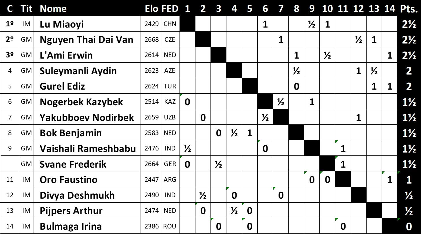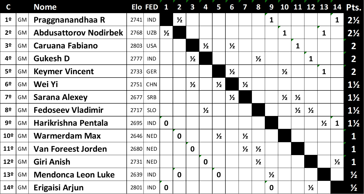 Abdusattorov 2,5 pontos 3º = Caruana, Gukesh, Keymer 2pts 6º = Wei Yi, Sarana, Fedoseev, Harikrishna 1,5 pontos 10º = Warmerdam, Van Foreest, Giri 1pt 13º = Mendonça, Erigaisi 0,5pts.
