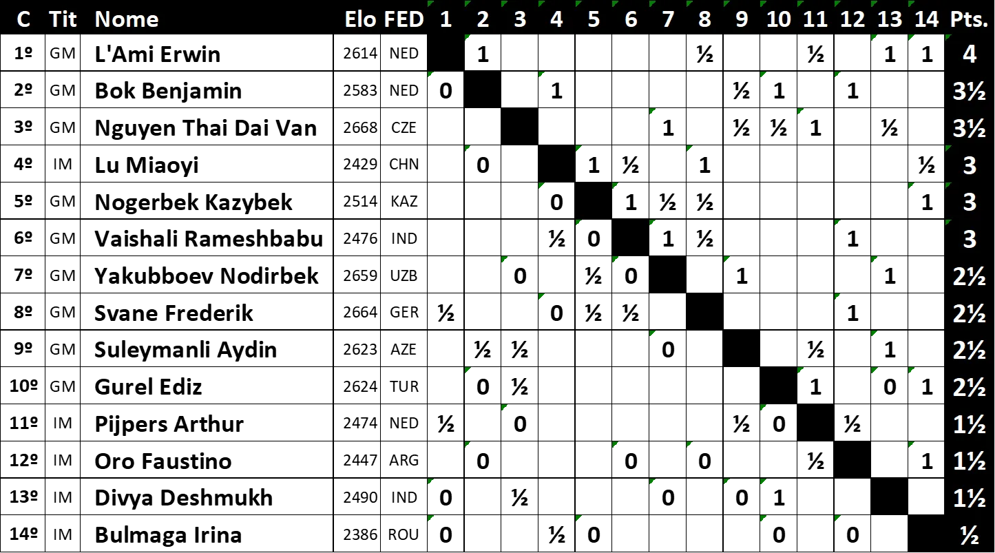 Classificação da 5ª rodada do Challengers: 1º L’Ami, Erwin 4pts 2º Bok, Nguyen 3.5pts 4º = Lu, Nogerbek, Vaishali 3pts, 7º = Yakubboev, Svane, Suleymanli, Gurel 2,5pts 11º Pijpers, Faustino Oro, Divya 1.5pts 14. Bulmaga 0.5pts