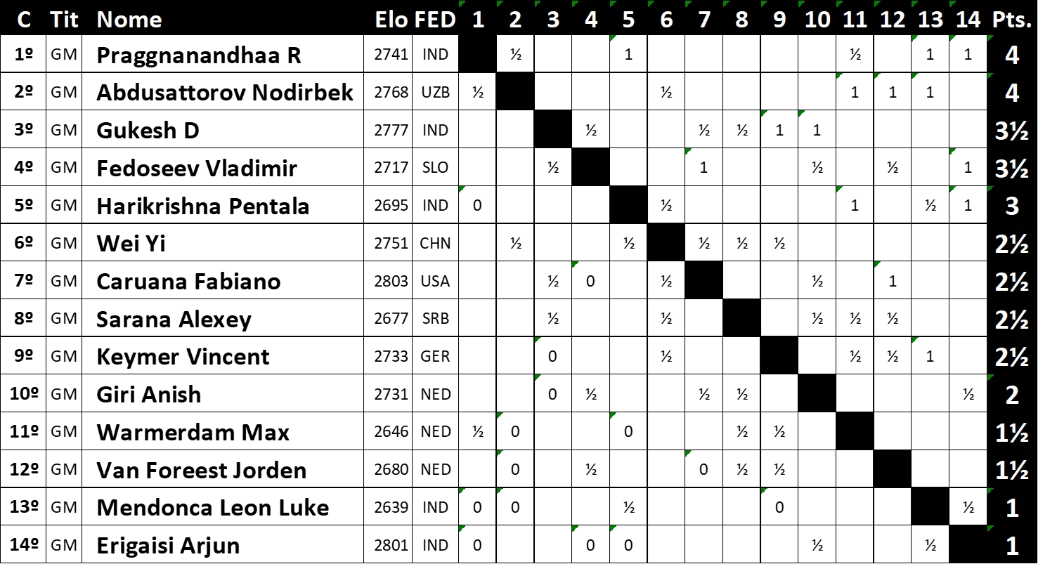 Classificação da 5ª rodada do Masters: 1º = Praggnanandhaa, Abdusattorov 4pts 3º = Gukesh, Fedoseev 3,5pts 5 Harikrishna 3pts 6º = Wei Yi, Caruana, Sarana, Keymer 2,5 pontos 10 Giri 2pts 11 Warmerdam, Van Foreest 1.5pts 13 Mendonça, Erigaisi 1pt