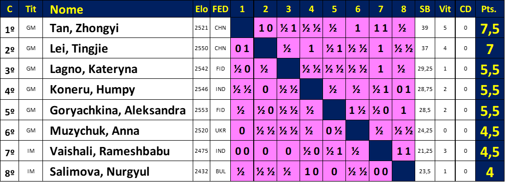 Neste momento, parece ser apenas uma questão de qual GM chinesa vencerá. Será Tan ou Lei? Ambas jogam de Negras na rodada 12. Se Lagno ou Salimova conseguirem vencer suas partidas, pode não ser mais uma disputa entre duas favoritas, mas isso também é uma tarefa difícil.
