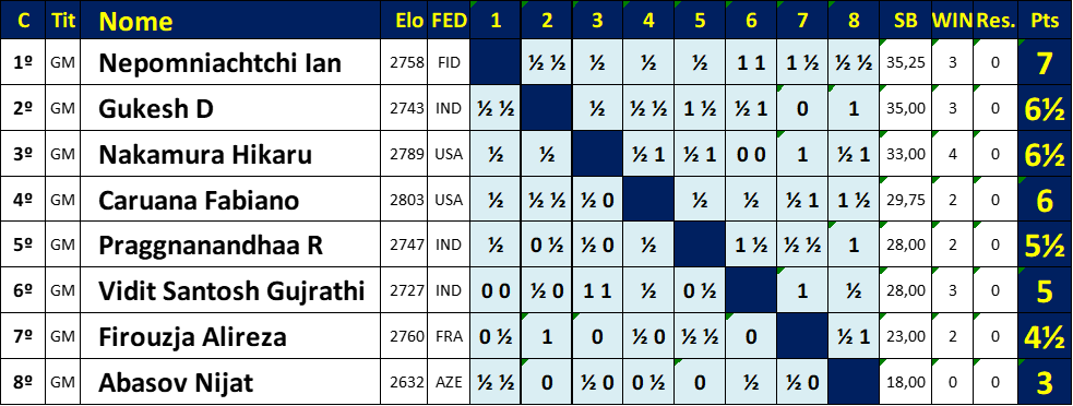 Dos quatro principais candidatos ao título, apenas Gukesh ainda não enfrentou o azarão Nijat Abasov pela segunda vez – o grande mestre do Azerbaijão tem um placar de 3/11 depois de perder para Alireza Firouzja em um jogo de 24 movimentos. Nepomniachtchi, por sua vez, enfrentará Praggnanandhaa, Nakamura e Caruana nas três rodadas finais do evento.