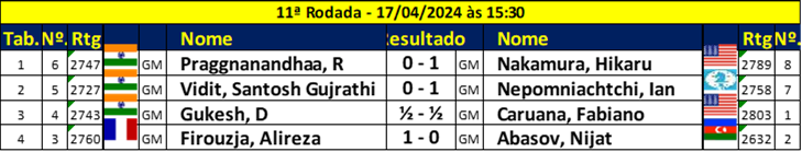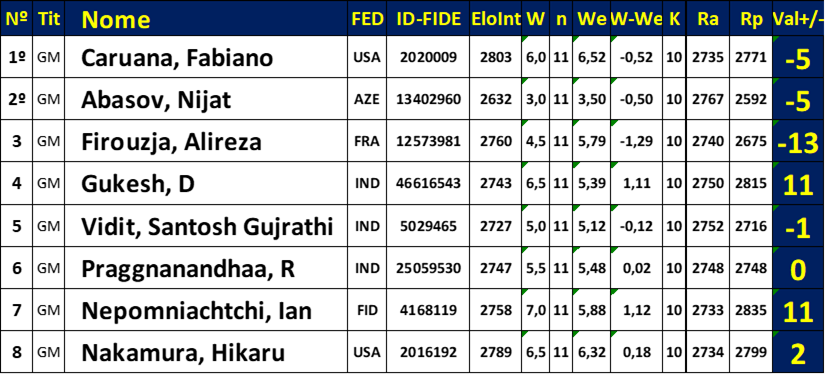 Faltam três rodadas para o fim desta maratona e cada partida é importante. Depois de conquistar sua vitória de Negras, Nepomniachtchi jogará de Brancas contra Praggnanandhaa. Nakamura buscará vencer contra Firouzja, e Gukesh talvez precise fazer o mesmo de Negras contra Abasov para se manter na disputa. Caruana está, mais ou menos, em uma situação onde é preciso vencer Vidit se quiser se manter na disputa.