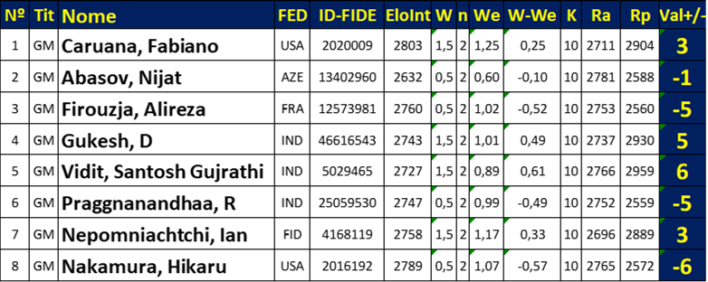 Na batalha dos prodígios, o GM Praggnanandhaa Rameshbabu sacrificou três peões contra o sempre inventivo GM Gukesh Dommaraju, mas não conseguiu provar compensação suficiente para o déficit de material. O GM Fabiano Caruana capitalizou em um erro surpreendente do GM Nijat Abasov.