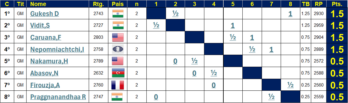 Na batalha dos prodígios, o GM Praggnanandhaa Rameshbabu sacrificou três peões contra o sempre inventivo GM Gukesh Dommaraju, mas não conseguiu provar compensação suficiente para o déficit de material. O GM Fabiano Caruana capitalizou em um erro surpreendente do GM Nijat Abasov.
