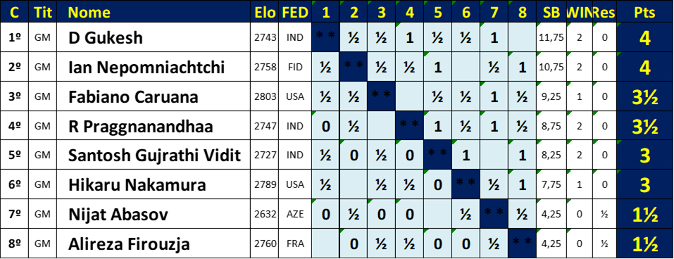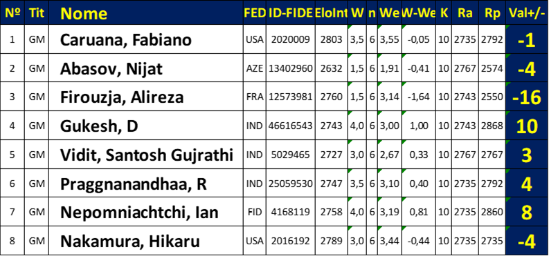 Classificação da 6ª rodada: 1º= Gukesh, Nepomniachtchi 4pts, 3º= Caruana, Praggnanandhaa 3.5pts, 5º= Vidit, Nakamura 3pts, 7º= Firouzja, Abasov 1.5pts.